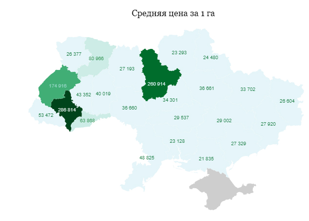 Что произошло с ценами на землю после открытия. За три месяца работы рынка покупки и продаж земли средняя цена за 1 га в 22 000 сделках была 44 860 грн ($1690). Самая высокая средняя цена в региональном разрезе была в Ивано-Франковской области — 315 000 грн, самая низкая в Херсонской — 22 000 грн. Из-за большого разброса цен, также приведем медианную цену — 31 500 грн ($1190).