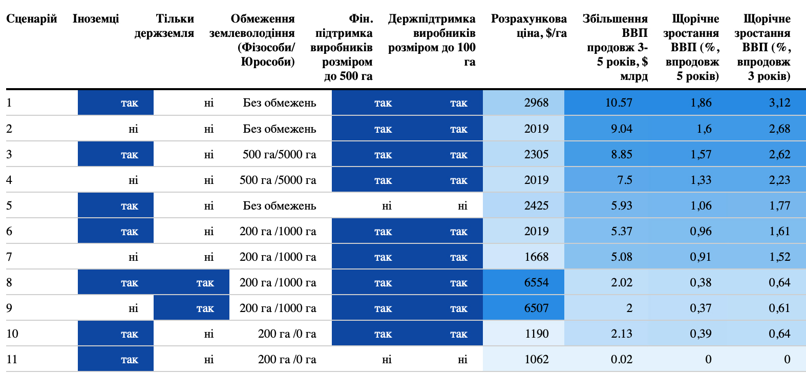 Народные депутаты выбрали далеко не лучший сценарий для цен на землю. Наибольший экономический эффект принес бы вариант с минимальным количеством ограничений, финансовой поддержкой малых сельхозпредприятий, чтобы улучшить доступ к капиталу и повысить их производительность. Согласно этому сценарию, дополнительный средний годовой прирост ВВП Украины в течение следующих пяти лет может достигать 1,9% (годовой прирост ВВП в докризисном 2019 был 3,2%), цена на землю выросла бы до $3000.