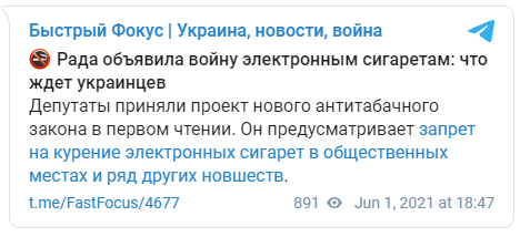 При этом он констатирует, что соцопрос Киевского международного института социологии свидетельствует о том, что 80% украинцев одобряют запрет курения в общественных местах табачных изделий для электрического нагрева. 92% опрошенных поддерживают запрет продажи несовершеннолетним устройств для нагрева табака и электронных сигарет.