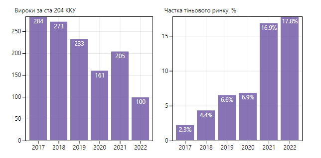 Конечно, количество приговоров не свидетельствует об эффективности системы. Оптимист сказал бы, что количество приговоров уменьшается, потому что люди меньше нарушают закон. Однако, по данным агентства Kantar Ukraine, нелегальный рынок табачных изделий в Украине, в 2017 году едва превышавший 2%, за 2022 год вырос до 17,8%.