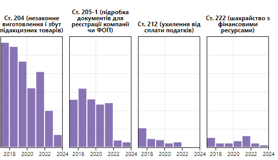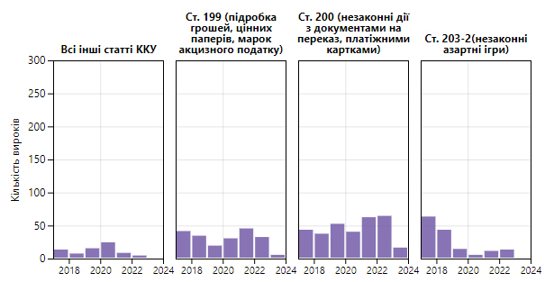 Авторы исследовали основные экономические статьи УК, как они фигурируют в резолютивной части приговоров, в частности: 199 – подделка денег, ценных бумаг, марок акцизного налога; 200 – незаконные действия с документами на перевод, платежными карточками, электронными деньгами; 203-2 – незаконные азартные игры; 204 – незаконное изготовление и сбыт подакцизных товаров; 205-1 – подделка документов для регистрации компании или ФЛП; 206 – противодействие законной хозяйственной деятельности; 212 – уклонение от уплаты налогов; 212-1 – уклонение от уплаты ЕСВ; 218-1 – доведение банка до банкротства; 219 – доведение до банкротства; 220-1 – нарушение порядка ведения базы данных о вкладчиках или формирование отчетности; 220-2 – фальсификация финансовых документов и отчетности; 222 – мошенничество с финансовыми ресурсами; 222-1 – манипулирование на организованных рынках; 223-1 – подделка документов, подаваемых для регистрации выпуска ценных бумаг; 224 – изготовление или сбыт поддельных ценных бумаг; 229 – незаконное использование ТМ; 231 – коммерческий шпионаж; 232 – разглашение коммерческой тайны; 232-1 – незаконное использование инсайдерской информации; 233 – незаконная приватизация.