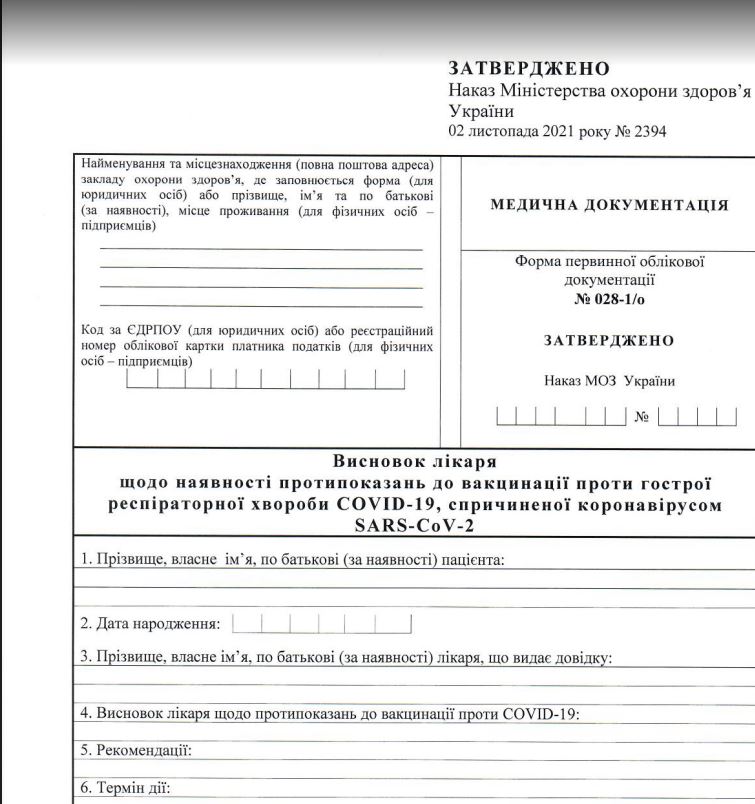 Министерство здравоохранения Украины утвердило форму справки, которую врачи будут выдавать пациентам, имеющим временные или постоянные противопоказания к вакцинации против COVID-19. Такие документы, в частности, нужны педагогам, а также работникам органов власти, которых с понедельника, 8 ноября, должны отстранять от работы без COVID-сертификата или документа о первой прививке против коронавирусной инфекции.