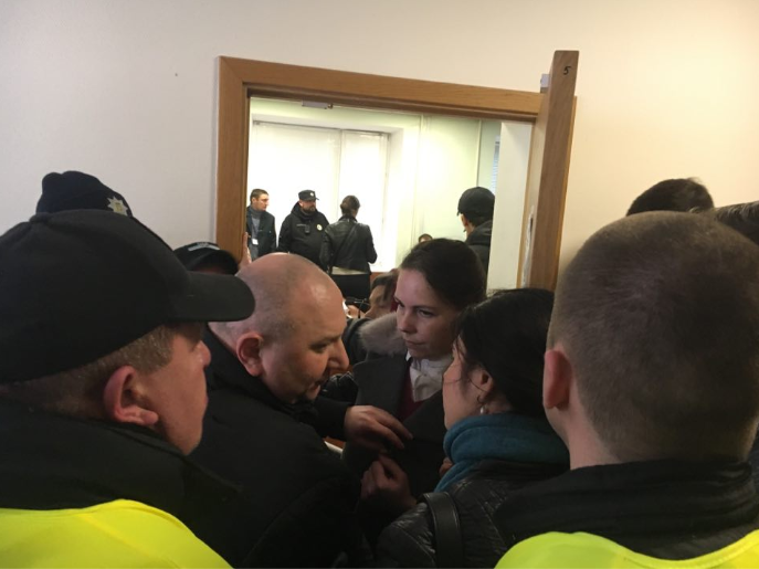 15:16 В суде произошла стычка после того, как Рубана и Савченко доставили в зал заседаний. Группа поддержки Надежды Савченко (ее сестра и Татьяна Проторченко) вошли в здание суда с колонкой, и попробовали прорвать кордон полиции, чтобы войти в зал.