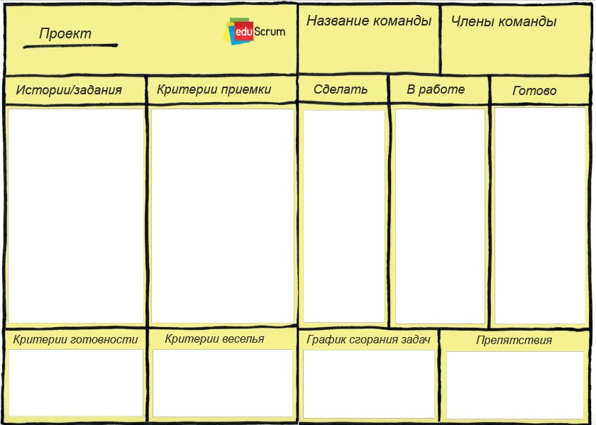 - Критерии готовности — перед началом спринта команда школьников определяет, когда их работа будет «окончена». В случае с неопытными командами список требований составляется под наблюдением учителя. Опытные команды определяют их самостоятельно.