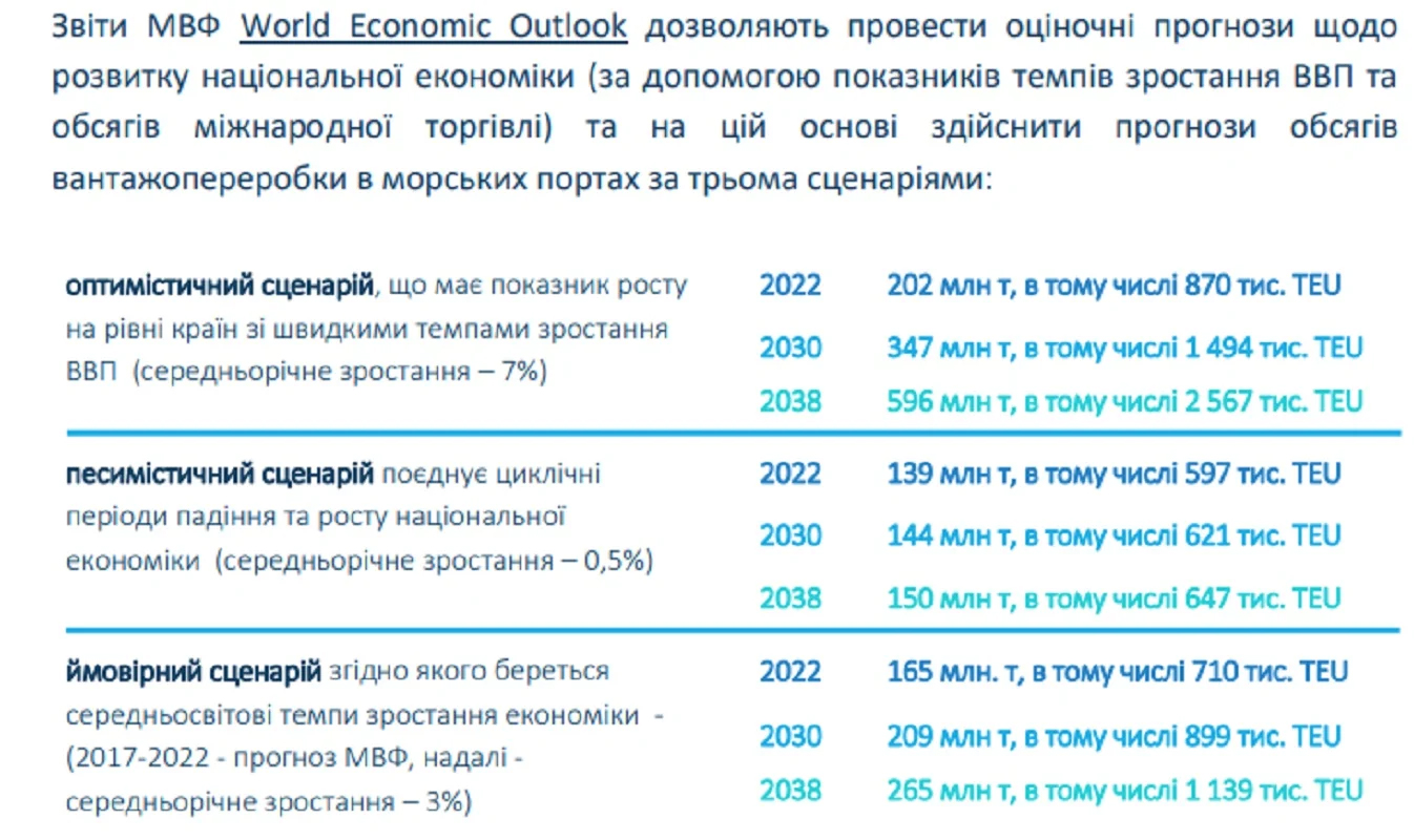 Прогнозные сценарии и некие цели по развитию портовой инфраструктуры Украины (в измерении показателя грузооборота), авторы стратегии, мягко говоря, занимательно рассчитывают, основываясь на определенных отчетах Международного валютного фонда. Например, в документе приводятся некие конечные результаты-сценарии развития портов Украины до 2038 года.