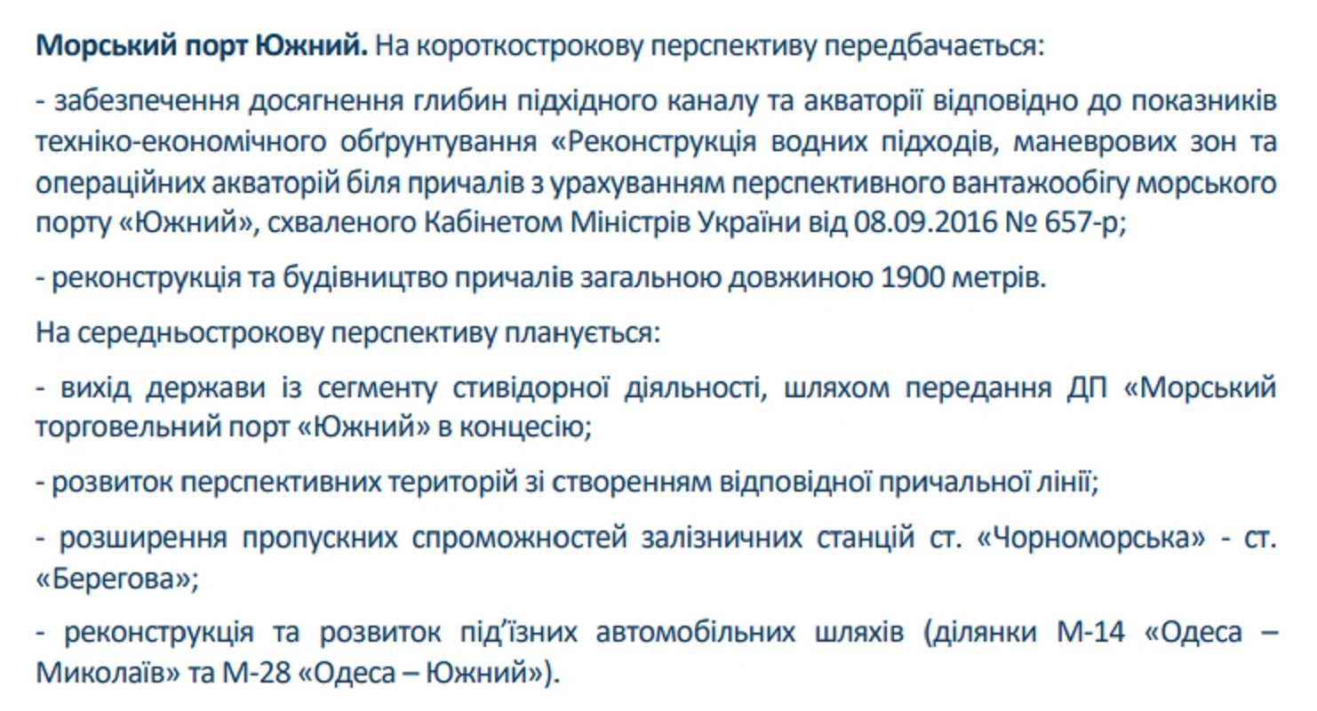 Еще в сентябре 2020 года министр Владислав Криклий описывал весьма амбициозный и обширный перечень готовящихся к концессии портовых объектов. «Концессии порта Измаила быть, Черноморску и паромной переправе – также быть. Кроме этого, дополнительно готовим к передаче в концессию Бердянский морской порт. Единственное — немного подождем с портом «Южный». Также в Фонд госимущества для подготовки приватизации переданы порты Усть-Дунайска и Белгород-Днестровска», – перечислял порты министр.