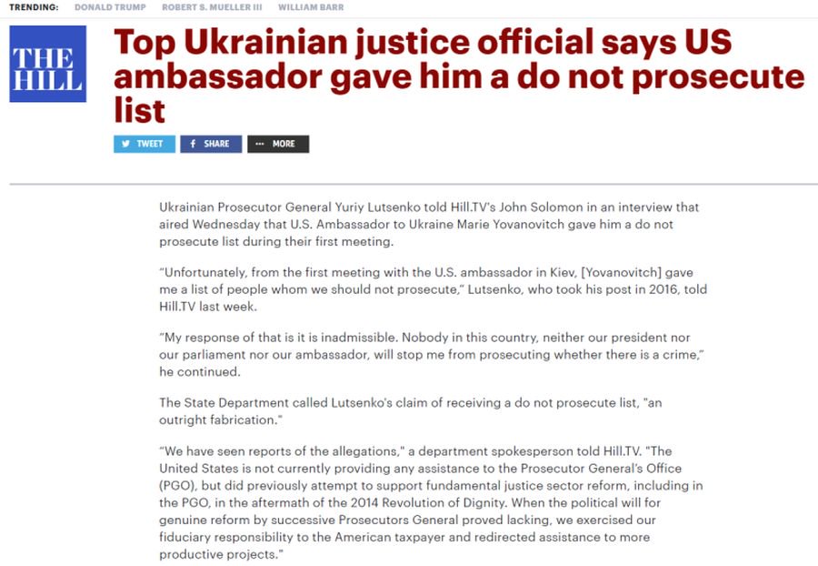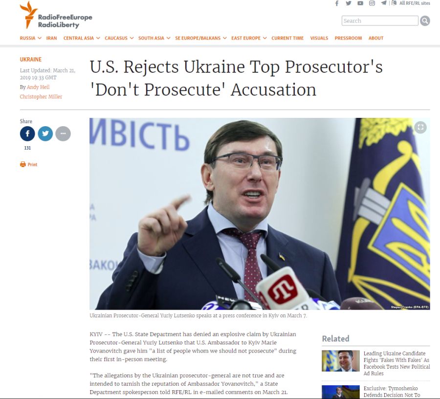 В этот день в разговоре с журналистом издания The Hill Юрий Луценко заявил, что посол США в Киеве Мари Йованович передала ему список людей, которых она якобы просила «не преследовать».