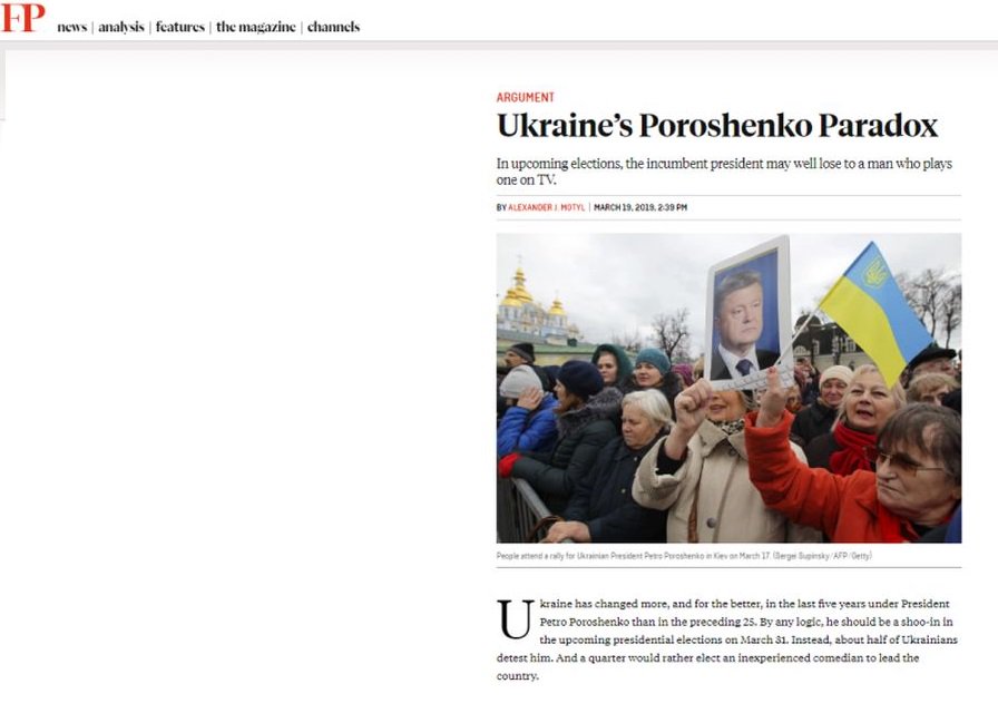 «Украина в течение последних пяти лет под руководством президента Петра Порошенко изменилась к лучшему больше, чем в предыдущие 25 лет, – утверждает Мотыль. – Было бы логично предположить, что Порошенко должен уверенно победить на предстоящих президентских выборах, которые состоятся 31 марта.