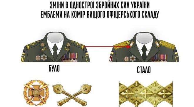 В Вооруженных силах Украины (ВСУ) к 1 сентября произвели очередную реформу кокард, шевронов, погонных и петличных знаков различия. У генералов на погонах ранее внизу звезд был металлический зигзагообразный элемент, как в армии Польши. Сейчас зигзаг перенесли с погон на ворот кителя. Убрали ранее полагавшиеся генералам перекрещенные булавы на отворотах кителя и петличные знаки родов войск. «Генерал, з латинського generalis, — общий и предназначенный для управления подразделениями разных видов и родов войск. То есть изображение его специальности на униформе является избыточным», — поясняют в Минобороны Украины.