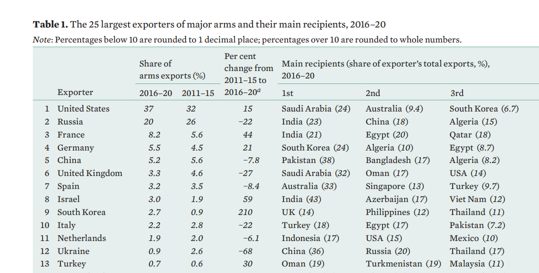 SIPRI отмечает, что в период 2016-2020 года количество экспортно-импортных трансакций на мировом рынке вооружений сократилось на 0,5% по сравнению с 2011-2015 годами и на 12% по сравнению с 2006-2010 годами.