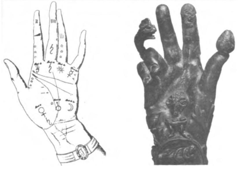 Справа: Рука Сабазия. Бронзовый символ синкретического иудейского мистического культа сахадос в Малой Азии. Около I века н. э. (Коллекция Британского музея)