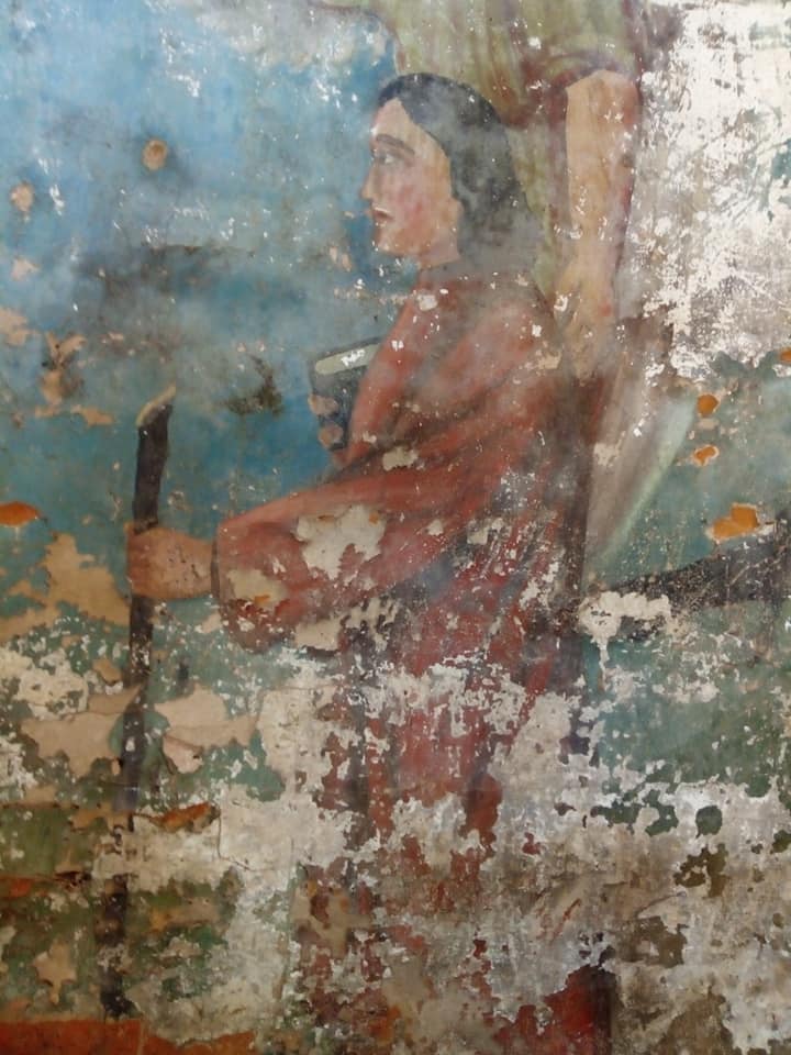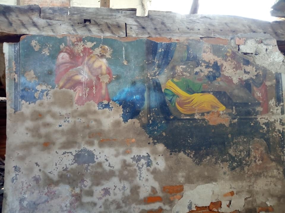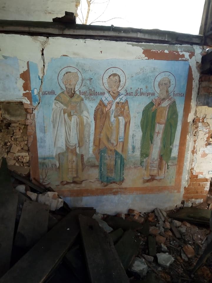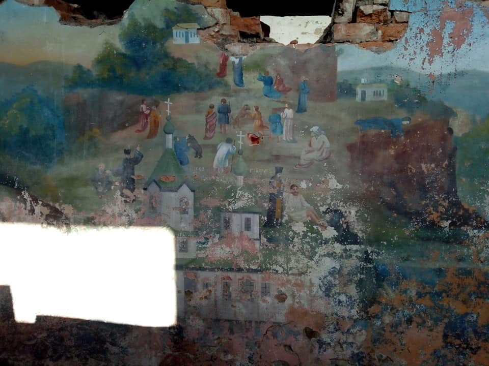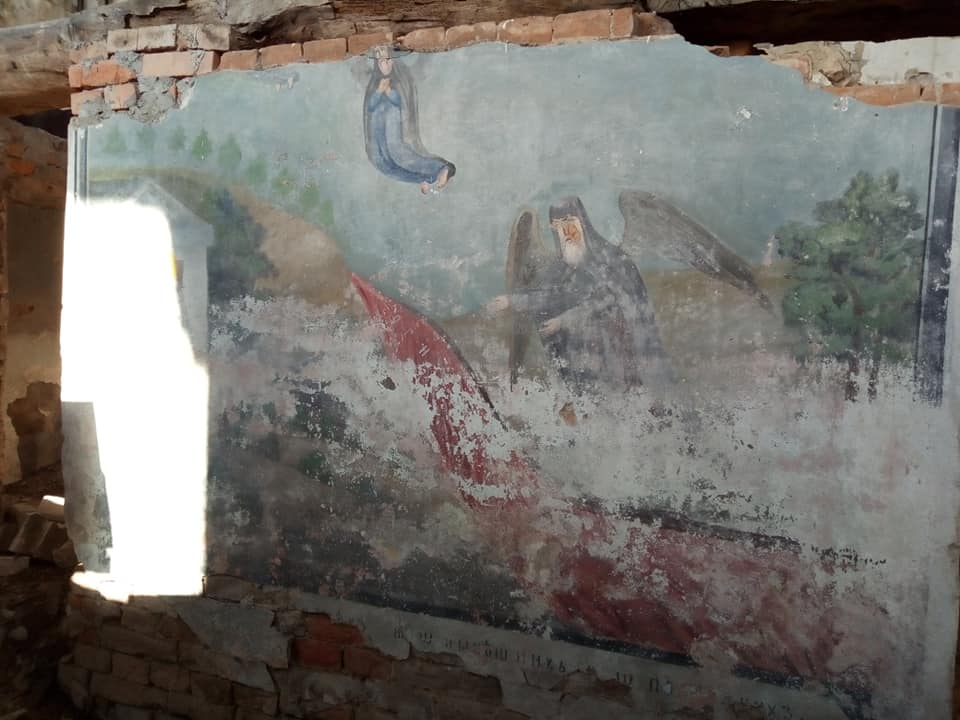 Сам ли это монастырь(вернее, его развалины)или вышеупомянутая школа — я так и не знаю. Поразительно здесь то, что при первом взгляде не видно. И если бы не упоминание одного из уважаемых краеведов о том, что там внутри должны быть росписи, можно было бы и не найти их, поскольку росписи украшают стены нижнего этажа, куда можно пробраться через отдельную дверь.