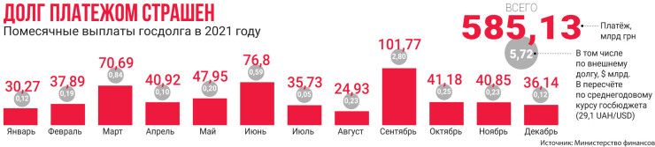 Повышение долговой нагрузки в период экономического кризиса — закономерное явление. Однако долги приходится отдавать. В 2021-м Украине предстоит выплатить 585,13 млрд грн, в том числе внешним кредиторам — около $5,72 (в пересчете по среднегодовому курсу госбюджета — 29,1 UAH/USD).