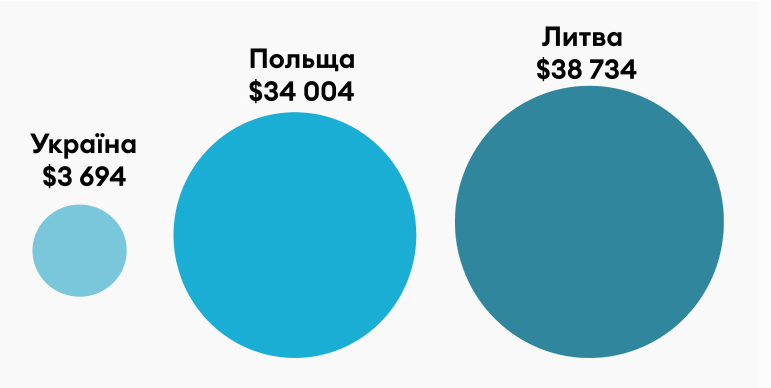 ВВП на душу населения в 2020 году в Литве, Польше и Украине