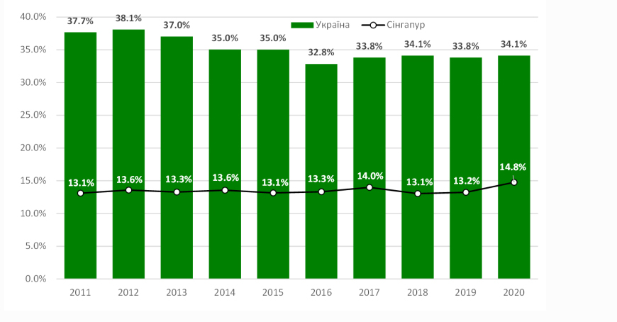 Налоговая нагрузка,% ВВП, Сингапур vs Украина