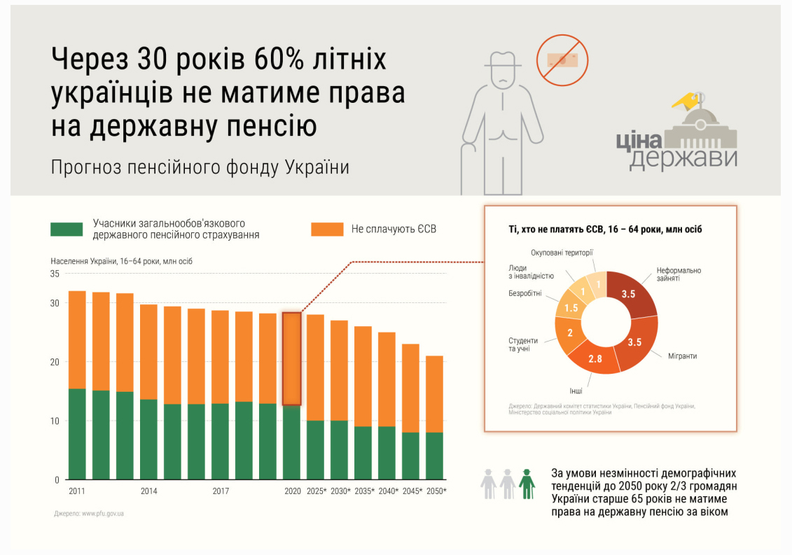 В Украине меньше чем 13 млн официально занятых, из которых 2,7 млн человек пенсионного возраста. Работающие должны содержать более 11 млн пенсионеров, 6,3 млн детей до 14 лет, 2,2 млн учащихся и студентов, 1,7 млн безработных и около 1 млн неработающих людей с инвалидностью. Это не было бы такой проблемой, если бы экономика была развита, производство высокотехнологичное, а производительность труда давала доходы на уровне Польши или Литвы. Однако украинская экономика слабая, и не всегда можно заработать так, чтобы хватило на налоги.