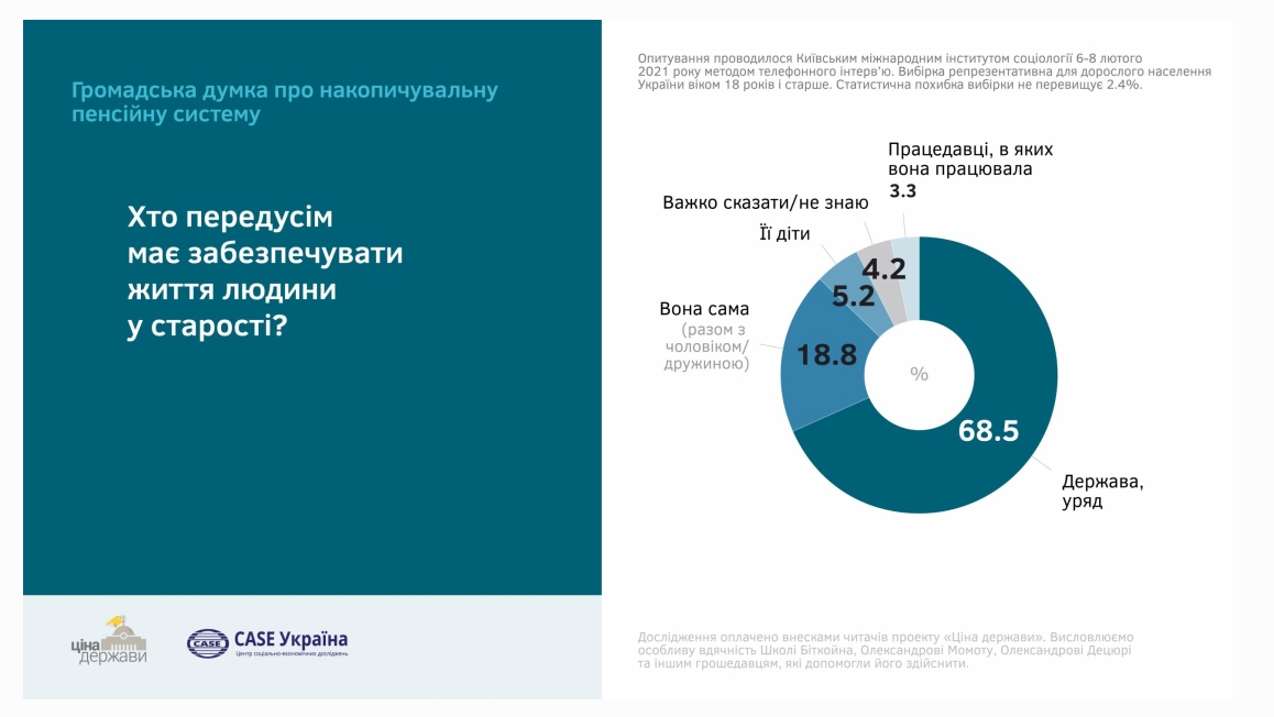 Поэтому первый шаг в построении устойчивой пенсионной системы будущего – это развеять иллюзии украинцев о государственной пенсии. Согласно опросу CASE Украина, 68,5% украинцев считают, что жизнь людей в старости должно обеспечивать государство. Такое мнение подавляющего большинства избирателей – это приговор для страны. Любую реформу в пенсионной сфере, даже такую умеренную, которую сейчас обсуждают (законопроект №2683), общество будет отбрасывать.