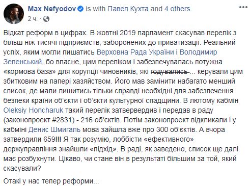 «В октябре 2019 года парламент отменил перечень из более чем тысячи предприятий, запрещенных к приватизации. Реальный успех, которым могли гордиться Верховная Рада Украины и Владимир Зеленский, потому что собственно, этим перечнем и обеспечивалась мощная «кормовая база» для коррупции чиновников, которые руководили этим ущербным на бумаге хозяйством. Его должен был заменить гораздо меньший список, где должны были остаться только действительно необходимые для обеспечения безопасности страны объекты и объекты культурного наследия», — напомнил Нефьодов.
