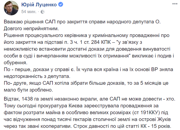 Про це повідомив у Facebook генеральний прокурор Юрій Луценко, коментуючи рішення Спеціалізованої антикорупційної прокуратури закрити справу Довгого.