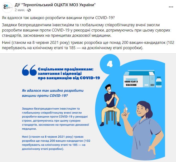 ГУ «Тернопольский ОЦКПХ МЗ Украины» сообщил, как удалось так быстро разработать вакцины против COVID-19. Ответ на этот вопрос появился на Facebook-странице ведомства.