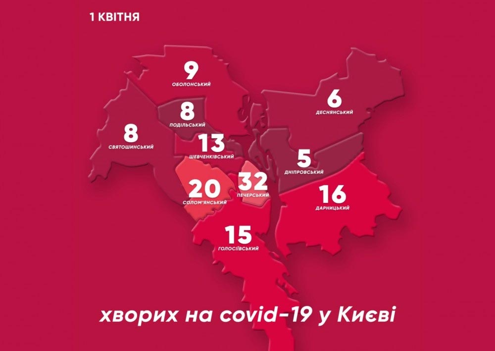 КГГА обнародовала статистику заражения коронавирусом Covid-19 в разных районах Киева по состоянию на среду, 1 апреля.