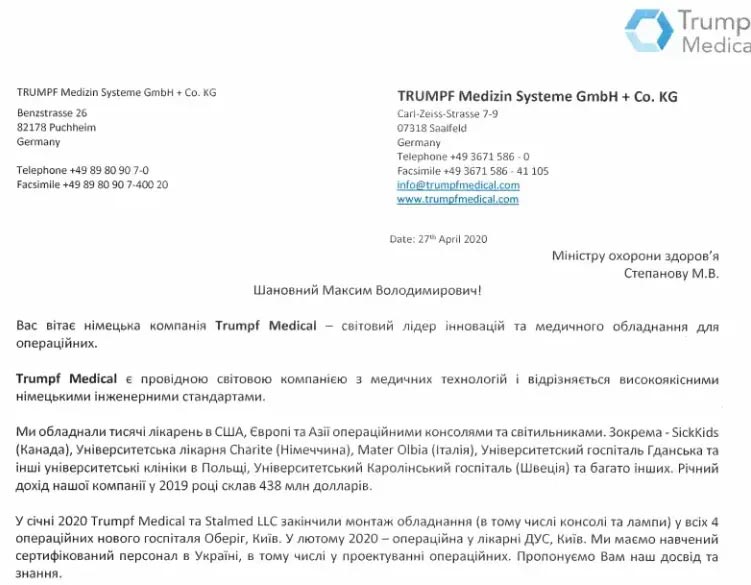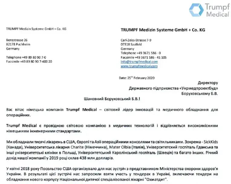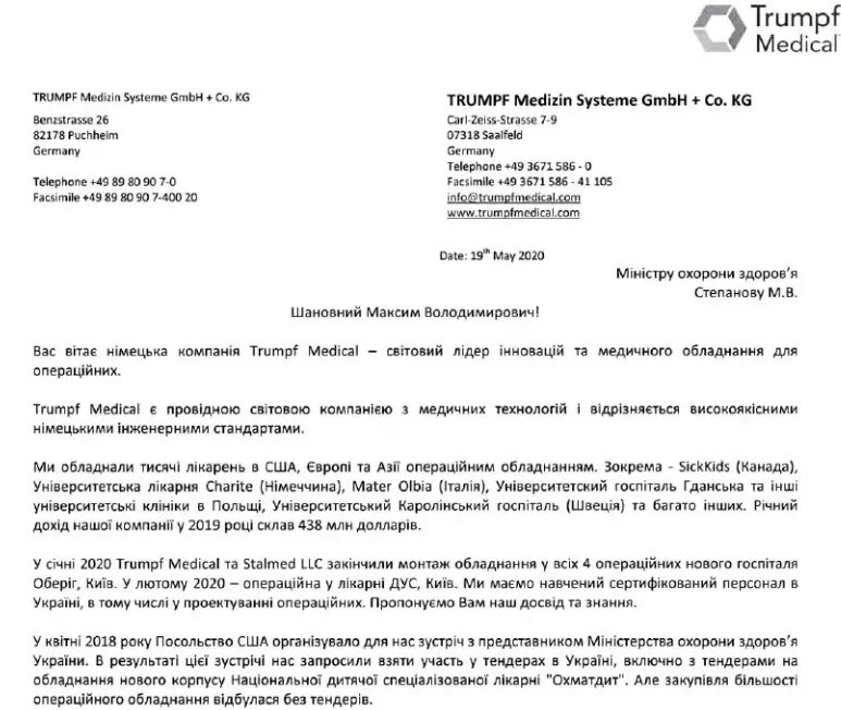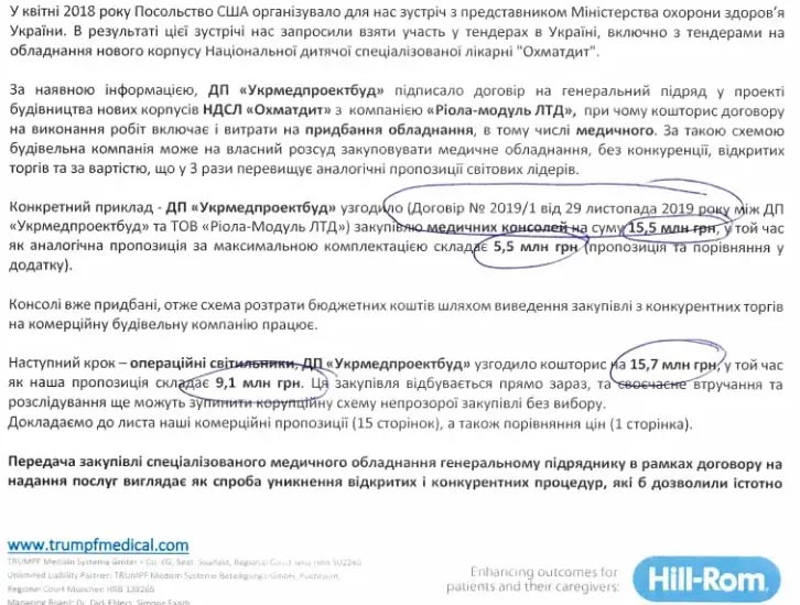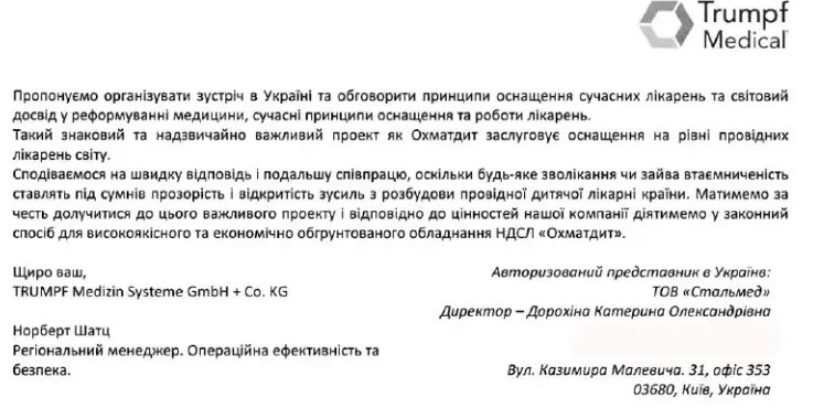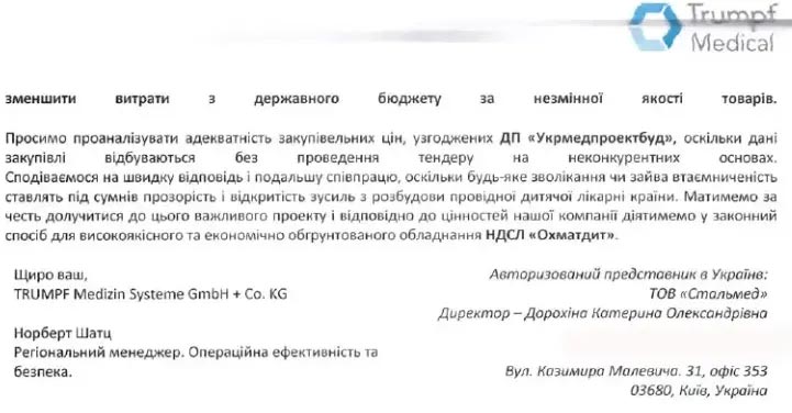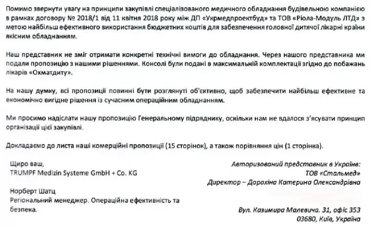 Даже одна спасенная детская жизнь стоит того, чтобы попытаться найти вариант закупки медицинского оборудования на средства госбюджета хотя бы по рыночной стоимости, не говоря уже о том, чтобы дешевле. Однако предложения одного из ведущих производителей медтехники Trumpf Medical (официальным представителем которого в Украине является ООО «Стальмед»), в этом году закончившего, например, монтаж оборудования во всех четырех операционных нового госпиталя «Оберіг» (в том числе консолей и светильников), а также операционной в больнице Государственного управления делами, были проигнорированы. ГП «Укрмедпроектбуд» даже не попытался сэкономить бюджет, разбив закупку и хотя бы часть товаров выставив на нормальные торги.