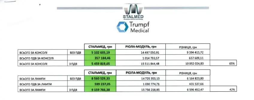 Далее, согласно утвержденной смете, закупка операционных светильников «Риолой-Модуль» обошлась государству в 15,7 млн грн. Сумма предложения от Trumpf Medical составляет 9,1 млн грн. Разница – 6,6 млн грн. Экономия могла бы составить около 42% от цены, указанной в смете. (Редакция располагает письмами, подтверждающими готовность Trumpf Medical поставить оборудование по более низким ценам).