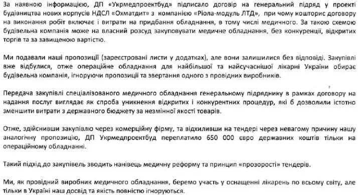 «А ведь на сэкономленные деньги, которых государству всегда не хватает, можно спасти не одну детскую жизнь. Это, как выясняется, не интересует ни Минздрав, ни уполномоченного им заказчика строительства ГП «Укрмедпроектбуд», ни генподрядчика ООО «Риола-Модуль ЛТД», к которому имеет отношение вновь назначенный министр Министерства защиты окружающей среды и природных ресурсов Роман Абрамовский.