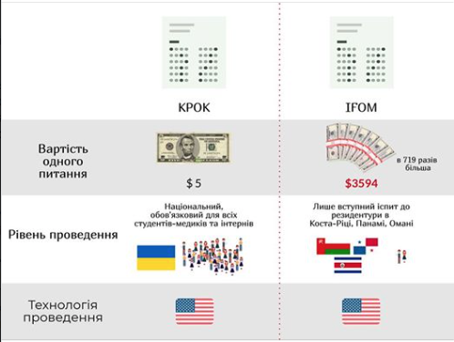 Стоимость украинских экзаменов «Шаг» почти в 7 раз меньше американского экзамена IFOM. Но в бюджет на 2019 год для бюджетных студентов за экзамен IFOM заложено 100 долларов США на каждого студента! А за контрактных студентов университеты оплатят уже из собственных поступлений, изъяв эти средства из расходов на подготовку студентов. И это не все. Студенты, которые не сдадут этот экзамен, должны заплатить за повторную сдачу собственные средства, которые их родители должны заработать. И таких студентов прогнозируемо будет более половины, даже если Минздрав установит минимально возможный критерий «сдал» в 30,5%. Поскольку подготовиться к экзамену с неизвестным содержанием, который «проталкивается» такими темпами, невозможно.