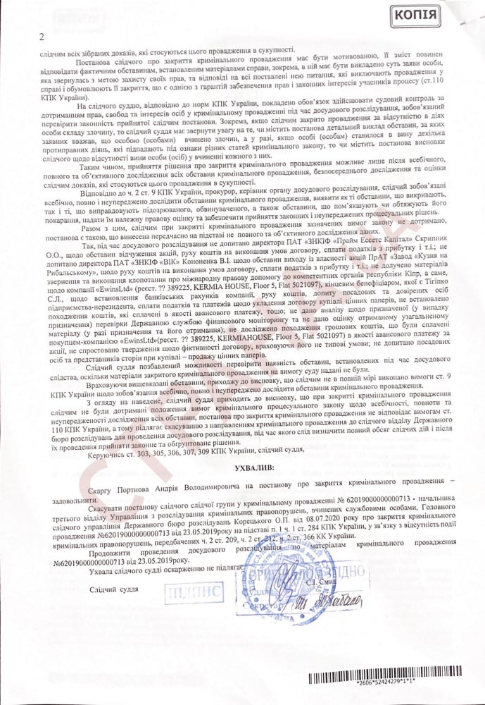«Учитывая приведенное, следственный судья приходит к выводу, что при закрытии уголовного производства следователям не были соблюдены положения требований уголовного процессуального закона о всесторонности, полноте и 110 УПК Украины, а потому подлежит отмене с направлением уголовного производства в следственный отдел Государственного бюро расследований для проведения досудебного расследования, во время которого следует определить полный объем следственных действий и после их проведения принять законное и обоснованное решение», — указано в документе