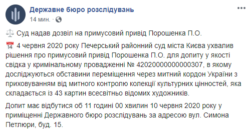 Допит має відбутися об 11 годині 00 хвилин 10 червня 2020 року у приміщенні Державного бюро розслідувань за адресою вул. Симона Петлюри, буд. 15.