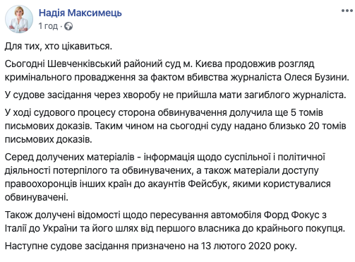 «Таким образом, сегодня суду предоставлены около 20 томов письменных доказательств… Среди приобщенных материалов — информация об общественной и политической деятельности потерпевшего и обвиняемых, а также материалы доступа правоохранителей других стран к аккаунтам Фейсбук, которыми пользовались обвиняемые», — отметила Максимец.