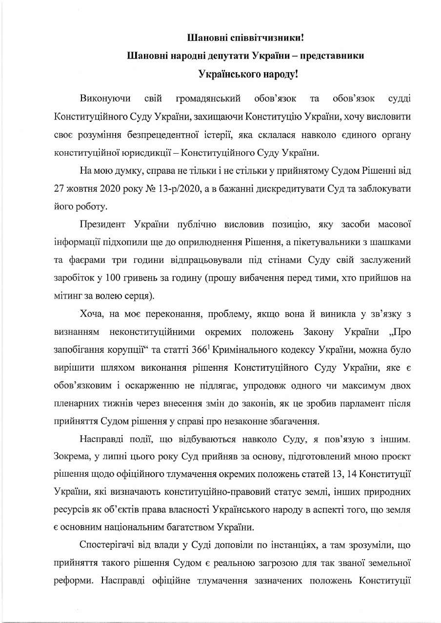 «В течение последних трех месяцев началось беспрецедентное давление со стороны представителей Президента Украины и Верховной Рады Украины в Конституционном Суде Украины «руками» НАПК, НАБУ, некоторых средств массовой информации на Суд в целом с целью его дискредитации, и отдельных судей, чтобы дестабилизировать работу суда, сделать его недееспособным, сделать невозможным принятие важных решений, в том числе, решение относительно официального толкования отдельных положений статей 13, 14 Конституции Украины», — заявил судья.