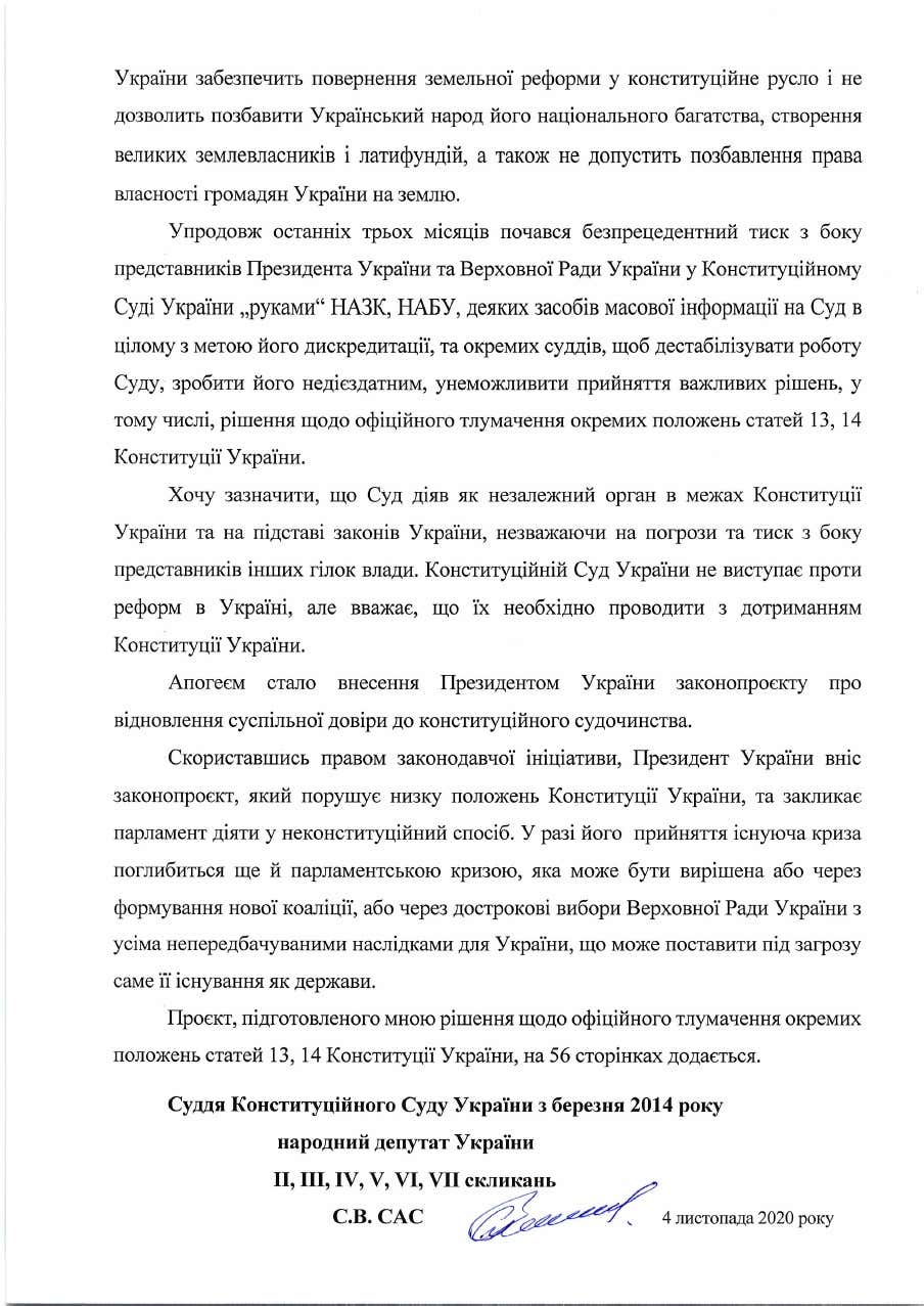 Сас заявил о том, что КСУ действовал как независимый орган и в пределах Конституции Украины несмотря на угрозы и давление со стороны представителей других ветвей власти. При этом судья назвал апогеем внесение президентом Зеленским законопроекта о восстановлении общественного доверия к конституционному судопроизводству.