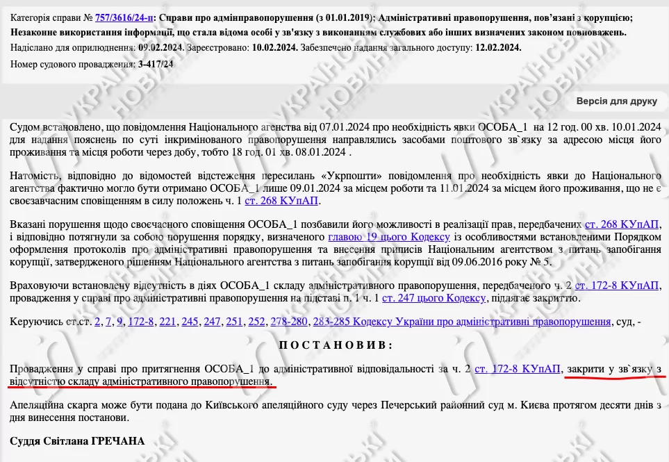 8 февраля Печерский суд закрыл производство по делу о привлечении Шмыгаля к административной ответственности по ч. 2 ст. 172-8 КУоАП в связи с отсутствием в его действиях состава административного правонарушения.