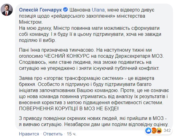 «Уважаемая Ульяна, меня откровенно удивляет позиция по«рейдерскому захвату»министерства Министром. По моему мнению, министр должен иметь возможность сформировать себе команду. И я буду ее в этом поддерживать, хотя не всегда разделяю ее выбор. Госпожа Инна предназначена временно. На следующей неделе мы объявим ЧЕСТНЫЙ КОНКУРС на должность госсекретаря МОЗ. Надеюсь, им станет человек, который сможет посмотреть на ситуацию непредвзято и снять существующий общественный конфликт. Заявление о «свертывании трансформации системы» — это откровенная ложь», — отвечает Гончарук в комментариях.