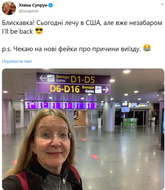 О своем отъезде бывшая чиновница сообщила накануне. Она опубликовала фотографию из аэропорта и сообщила, что отправляется в США. При этом Супрун пообещала, что уже «скоро» вернется в Украину, не уточнив сроки.