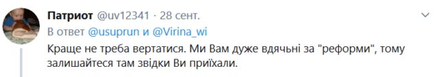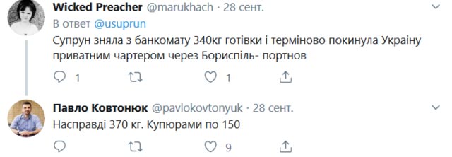 «Супрун сняла с банкомата 340кг наличности и срочно покинула Украину частным чартером через Борисполь — Портнов», «А вы сняли со счетов свои 340 млн. баксов и рассовали по карманам?», «Убегаете с чемоданами кэша?», «Украла в аптеках все пилюли и повезла продавать. Удачи, госпожа Супрун», «Лучше не надо возвращаться. Мы Вам очень благодарны за «реформы», поэтому оставайтесь там откуда Вы приехали», — с иронией пишут люди.