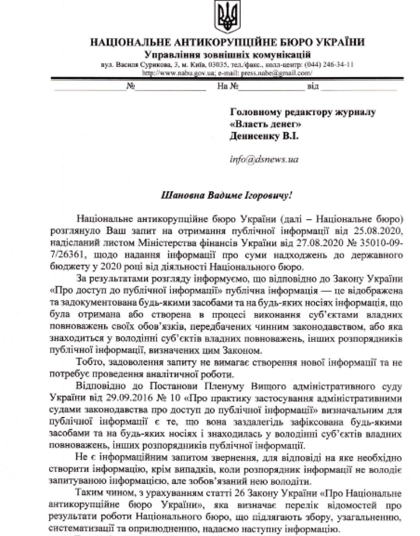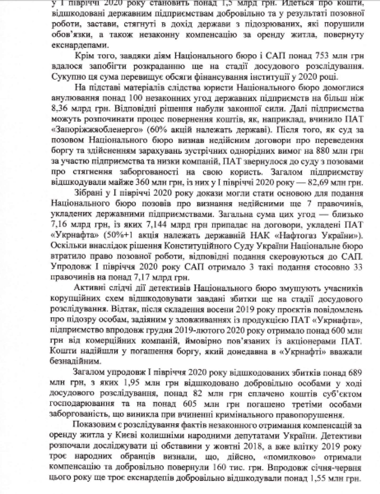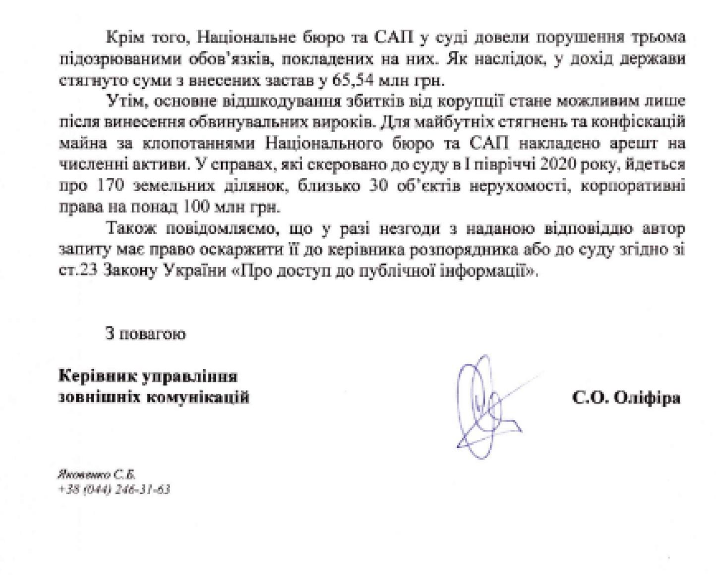 Так, еще 17 августа во время брифинга директор НАБУ Артем Сытник заявил, что экономический эффект от работы НАБУ в I полугодии 2020 составил более 1,5 млрд грн. В НАБУ был направлен запрос с просьбой уточнить, на чем именно бюро заработало эти средства для бюджета страны. В ответе было сказано: за I полугодие 2020 бюджет от деятельности НАБУ получил не 1,5 млрд, а 689 млн грн, из которых «1,95 млн грн возмещено добровольно лицами в ходе досудебного расследования, более 82 млн грн уплачено средств субъектом хозяйствования и более чем 605 млн грн погашена третьими лицами задолженность, возникшая при совершении уголовного правонарушения «