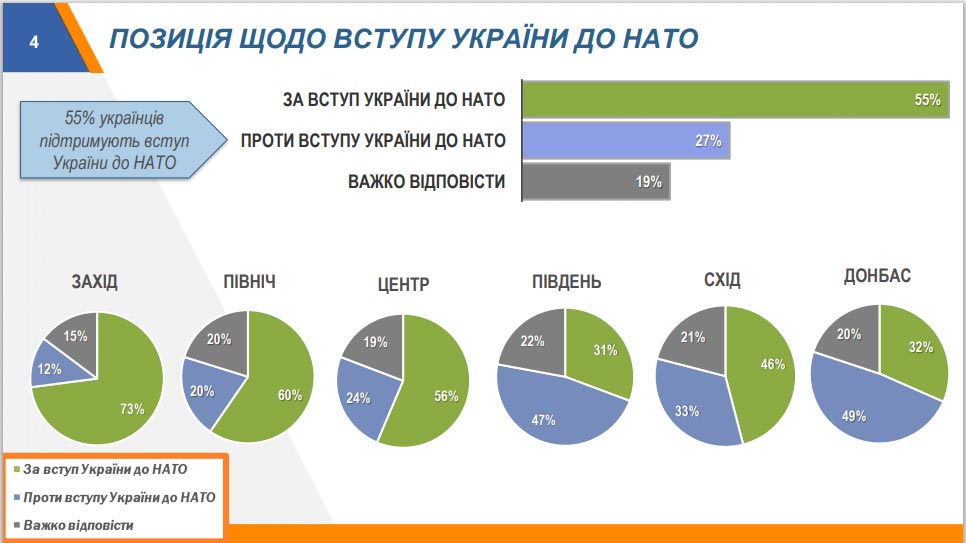 В общей сложности более четверти населения – 26,5 % опрошенных – выступает против присоединения Украины к НАТО. Меньше всего сторонников евроатлантической интеграции страны на юге (29%) и в Донбассе (29,2%), антирекорд поддержки зафиксирован в Луганской области – 16% респондентов.