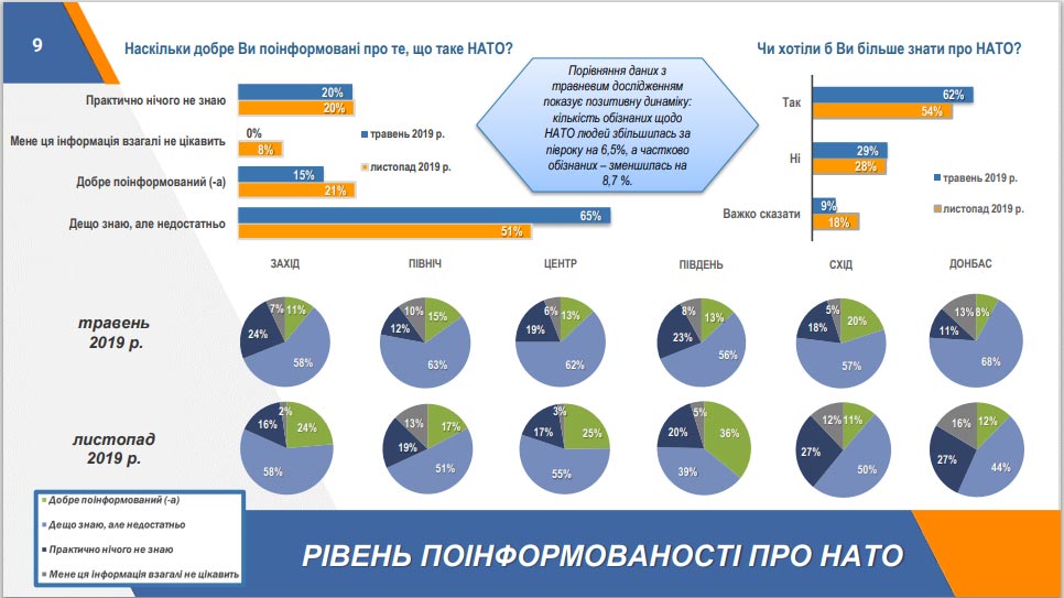 Среди 54,5% украинцев, поддерживающих вступление Украины в Альянс, наиболее активно болеют за НАТО жители западного региона (68,5 %), центральных (48,5%) и северных областей (54,8%). На востоке страны этот показатель немного ниже — 42,9 % опрошенных. Рекорд поддержки зафиксирован во Львовской области – здесь евроатлантическую интеграцию поддерживают 80% респондентов.