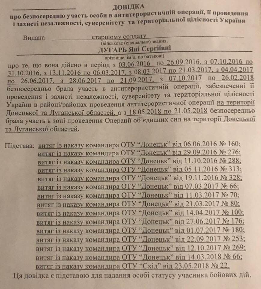 В справке, выданной старшему солдату Яне Дугарь, указано, что она принимала участие в АТО в семь разных периодов с 2016 по 2018 годы: с 3.06.2016 по 26.09.2016 года, с 07.10.2016 по 31. 10. 2016 года, с 13.11.2016 по 06.03.2017 года, с 08.03.2017 по 21.03. 2017 года, с 04.04.2017 по 26.06.2017 года, с 28.06.2017 по 21.09.2017, с 07.10.2017 по 26.02.2018 года.