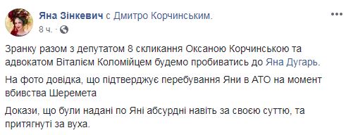 «На фото справка, подтверждающая пребывания Яны в АТО на момент убийства Шеремета. Доказательства, предоставленные в отношении Яны, абсурдны даже по своей сути, и притянуты за уши», — отметила Зинкевич.