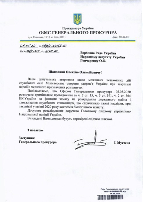 Офис генерального прокурора открыл уголовное производство относительно возможных незаконных действий работников Министерства здравоохранения при закупке медицинских защитных костюмов по завышенным ценам