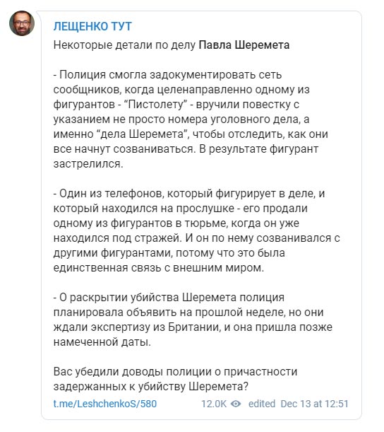 «Он по нему созванивался с другими фигурантами, поскольку это была единственная связь с внешним миром. О раскрытии убийства Шеремета хотели сообщить еще на прошлой неделе, но ждали экспертизы из Великобритании, которая пришла позже, чем было запланировано», – рассказал Сергей Лещенко .