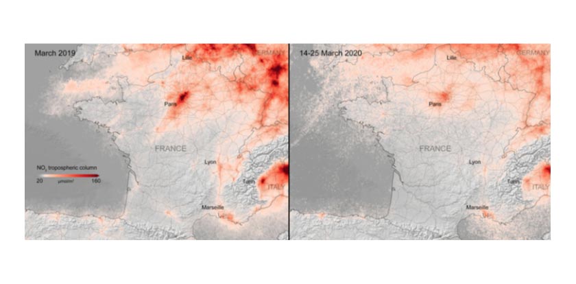 На снимках, которые получил Copernicus Sentinel-5P можно сравнить состояние воздуха над Францией. Первый снимок был получен в марте 2019 года, второй – в марте нынешнего. Чем интенсивнее красный цвет — тем больше вредных испарений содержится в воздухе.