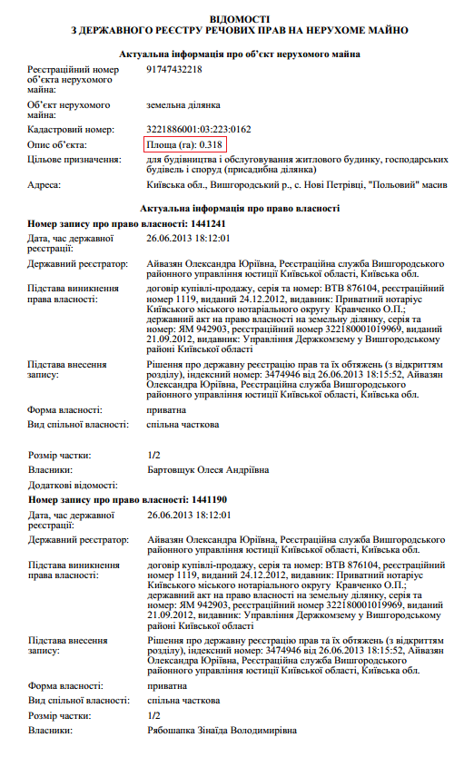 Однако Руслан Рябошапка в своей декларации, поданной на должность генерального прокурора, указал, что площадь участка в Новых Петровцах составляет не 0,318 гектара, как записано в реестре недвижимости, а 318 квадратных метров: