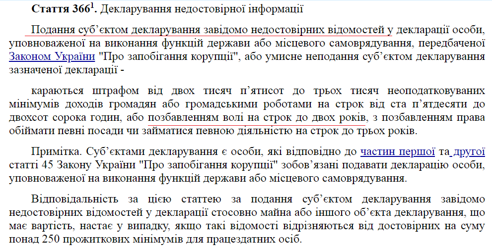 В соответствии со статьей 366-1 Уголовного кодекса Украины предусмотрена уголовная ответственность за подачу субъектом декларирования заведомо недостоверной информации в его декларации: