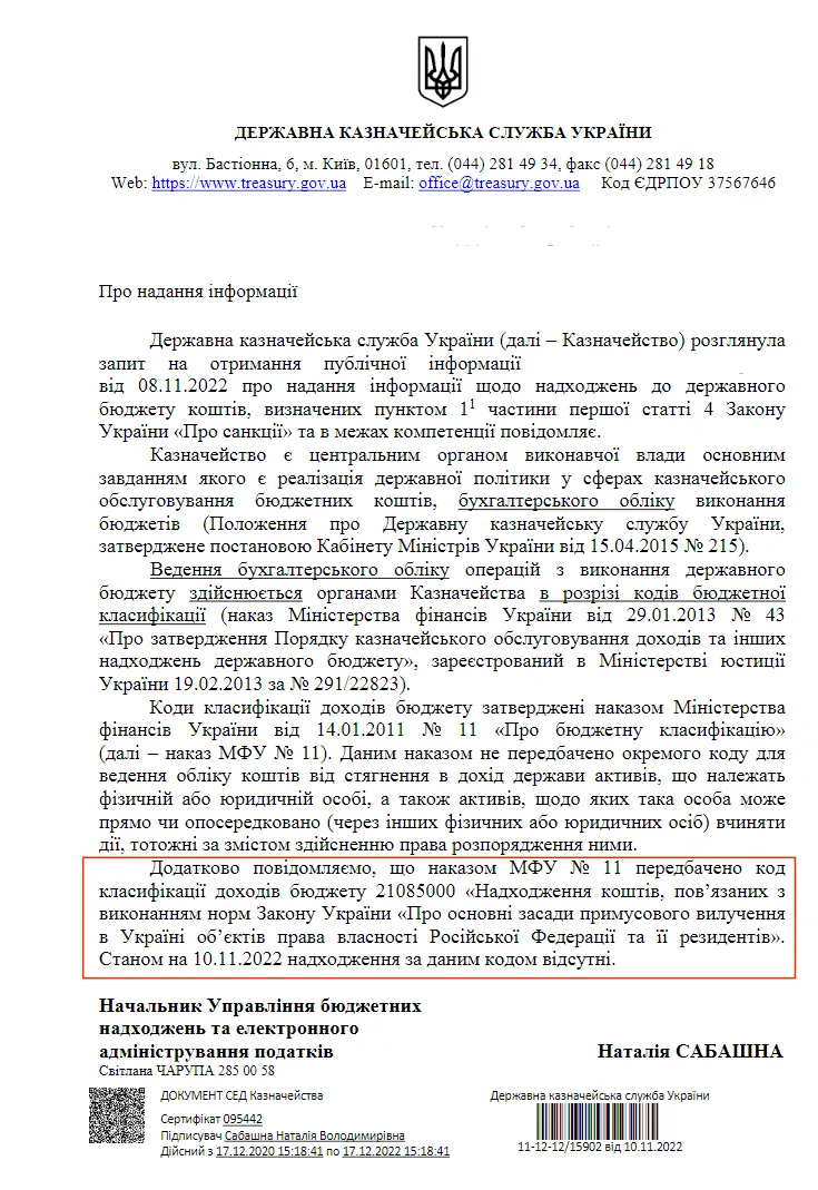 «Приказом МФУ (Минфина. – Ред.) № 11 предусмотрен код классификации доходов бюджета 21085000 «Поступление средств, связанных с исполнением норм Закона Украины «Об основных принципах принудительного изъятия в Украине объектов права собственности Российской Федерации и ее резидентов». По состоянию на 10.11.2022 поступления по данному коду отсутствуют«, – говорится в письме Госказначейства.