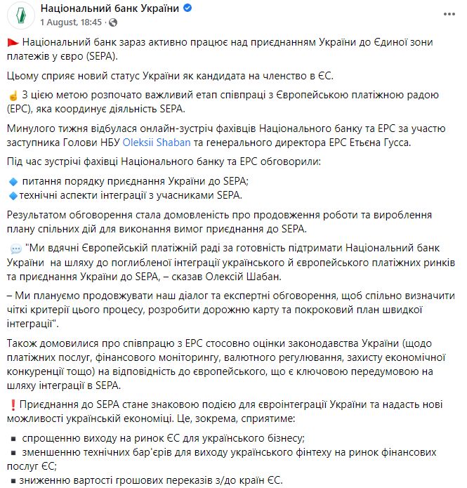 «Мы благодарны Европейскому платежному союзу за готовность поддержать Национальный банк Украины на пути к углубленной интеграции украинского и европейского платежных рынков и присоединения Украины к SEPA», — отметил заместитель председателя НБУ Алексей Шабан.